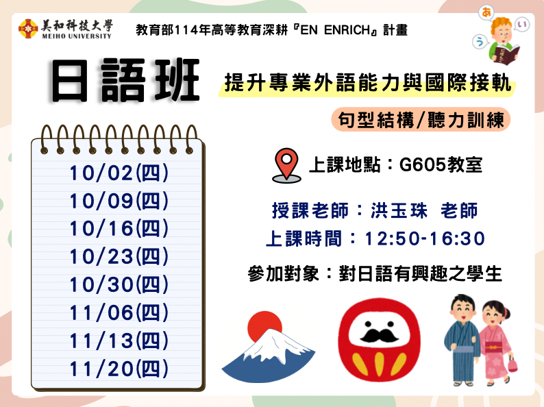 透過密集課程,讓未具備基礎日語之學生有機會學習第二外語與異國文化,未來能朝向更高的學習目標邁進,同時也藉此儲備學生具有國際移動的能力。學生以培養其國際移動力為前提,藉由輔導加強其外語溝通表達能力,同時亦強化專業具國際移動特色之外語課程。